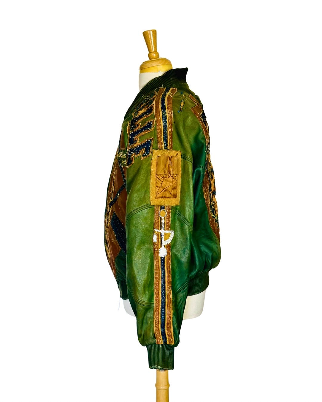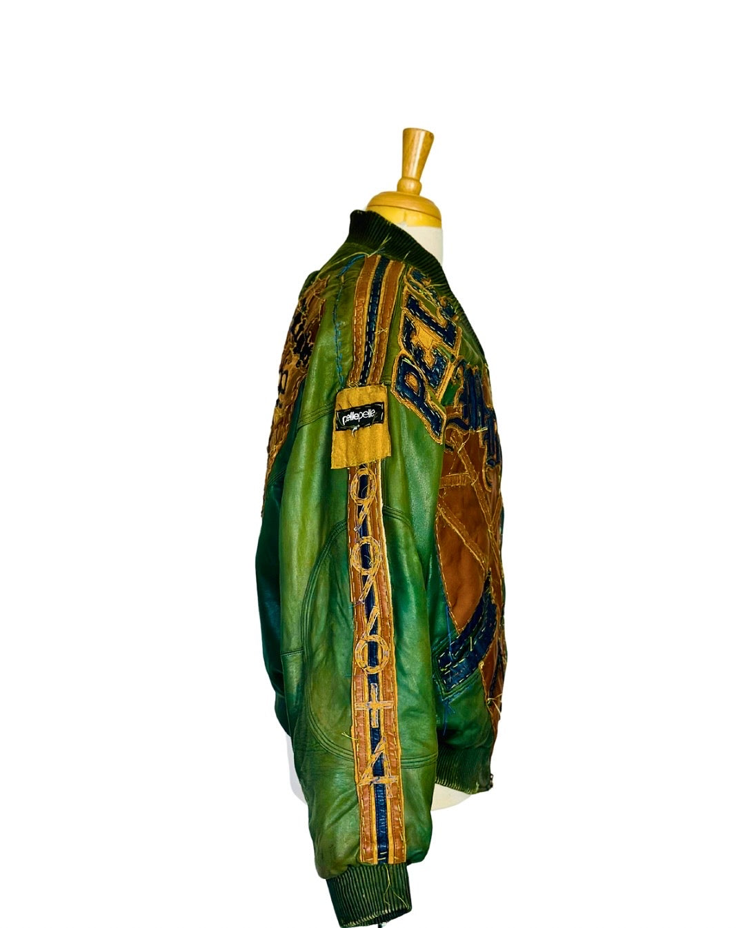 This Pelle Pelle masterpiece radiates bold energy and craftsmanship with a commanding presence. The deep emerald green leather base is paired with rich caramel panels and accented by navy blue appliqué and embroidery, forming a striking balance of color and texture. Across the shoulders, the oversized “PELLE PELLE” script announces heritage and authority, while Marc Buchanan’s signature detail affirms its designer legacy.